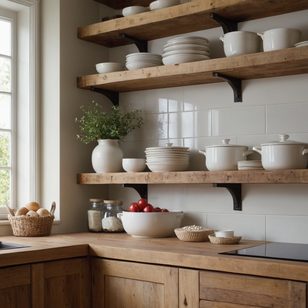 Practical Advice: Use baskets and decorative bins to organize smaller items like utensils and spices, creating an organized yet visually appealing display. Ensure that your open shelves are placed at a comfortable height for easy access.