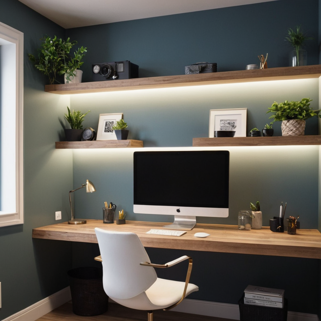 Utilize the walls by installing shelving units to store books, binders, and other office supplies. Floating shelves are stylish and free up valuable desk space, keeping your area clear and organized.
