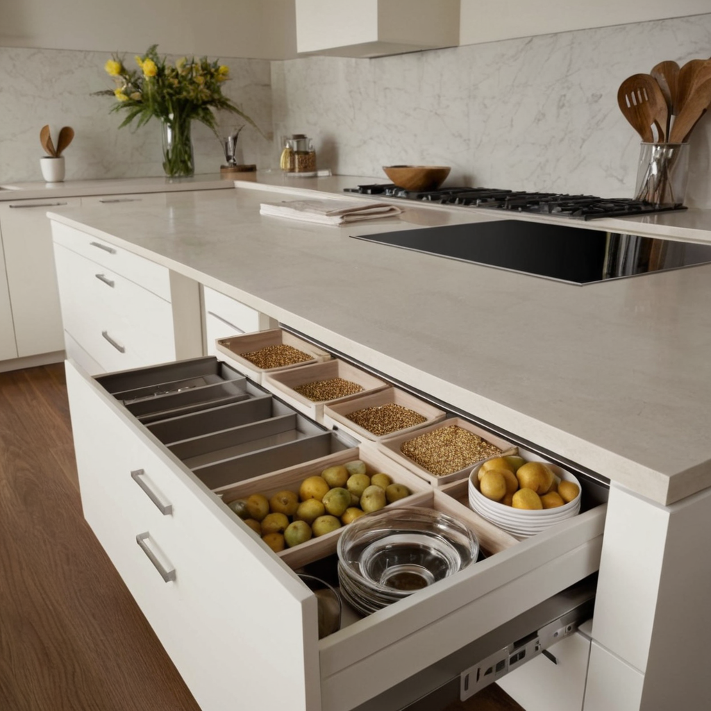 Consider incorporating drawers with dividers for smaller utensils or deep cabinets with adjustable shelving to store larger items like pots and pans. For a clean look, use soft-close hinges and drawer slides that ensure smooth operation without noise.