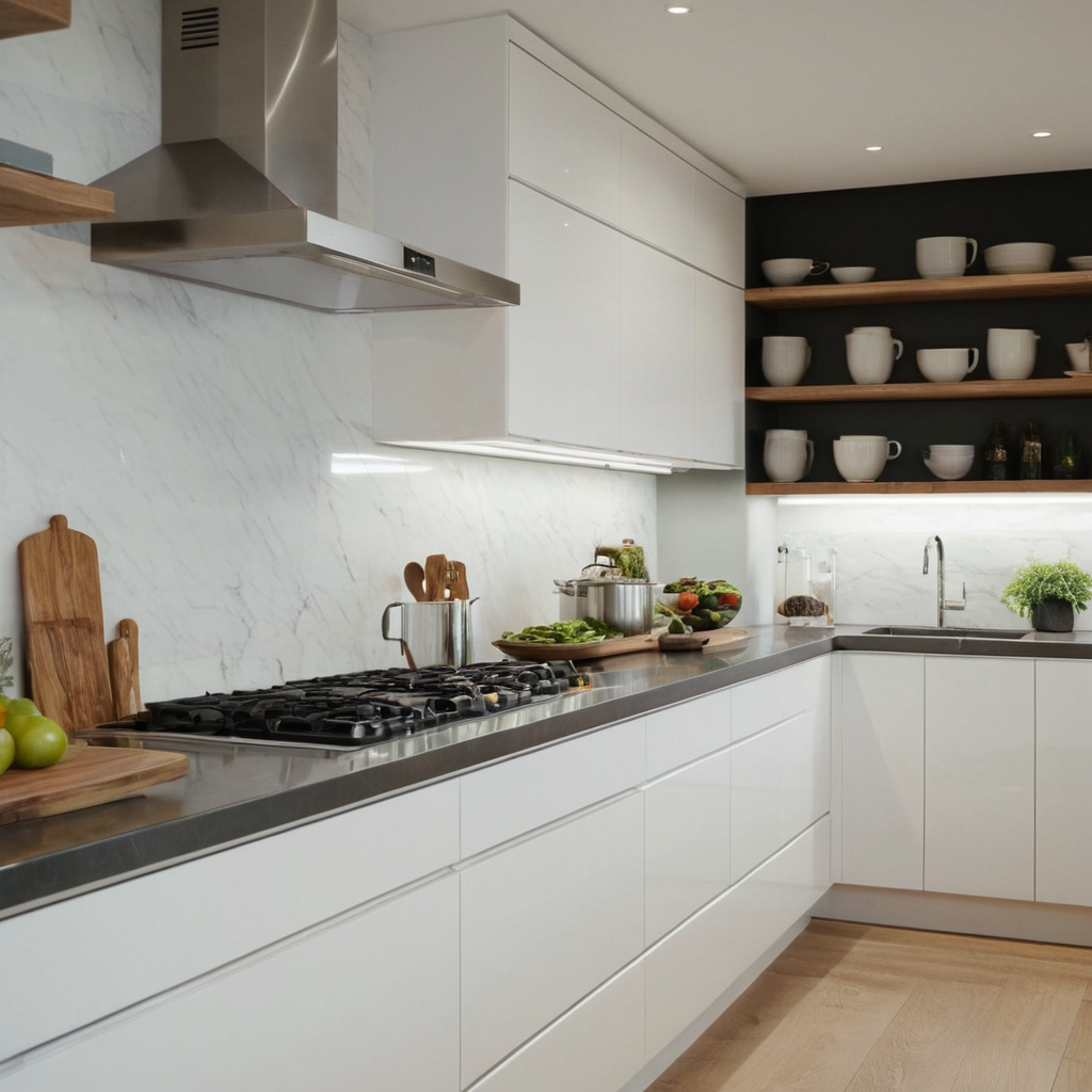 Open shelving has become a popular trend in modern kitchens due to its ability to create an airy, open feel while showcasing stylish cookware or decorative items. This design element not only adds visual interest but also serves as a functional storage solution for frequently used items like dishes and glasses.